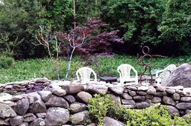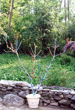 I have the reputation in the neighborhood of painting things that have seen better days (Judy’s Journal 2009 June - Response to the Ice Storm: A Collaboration). The fig tree would be no different. Paints came out, take-out containers for mixing colors appeared, and barrels were overturned to hold a board: Voila! John had created my outdoor studio once again.